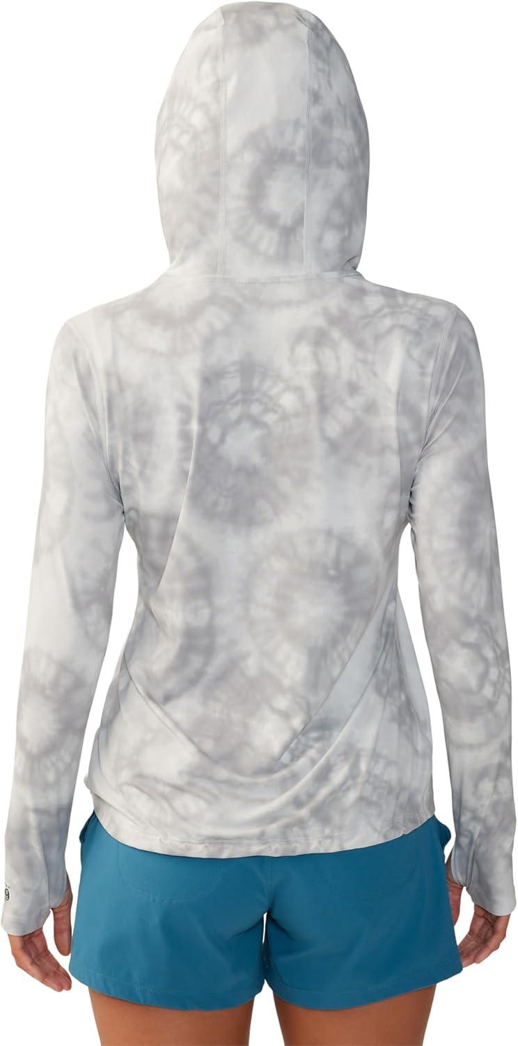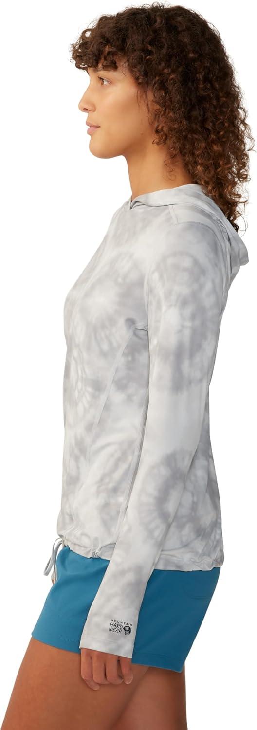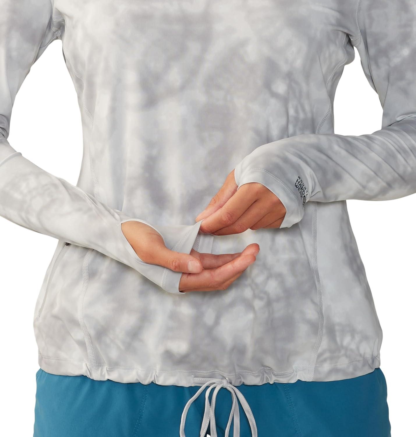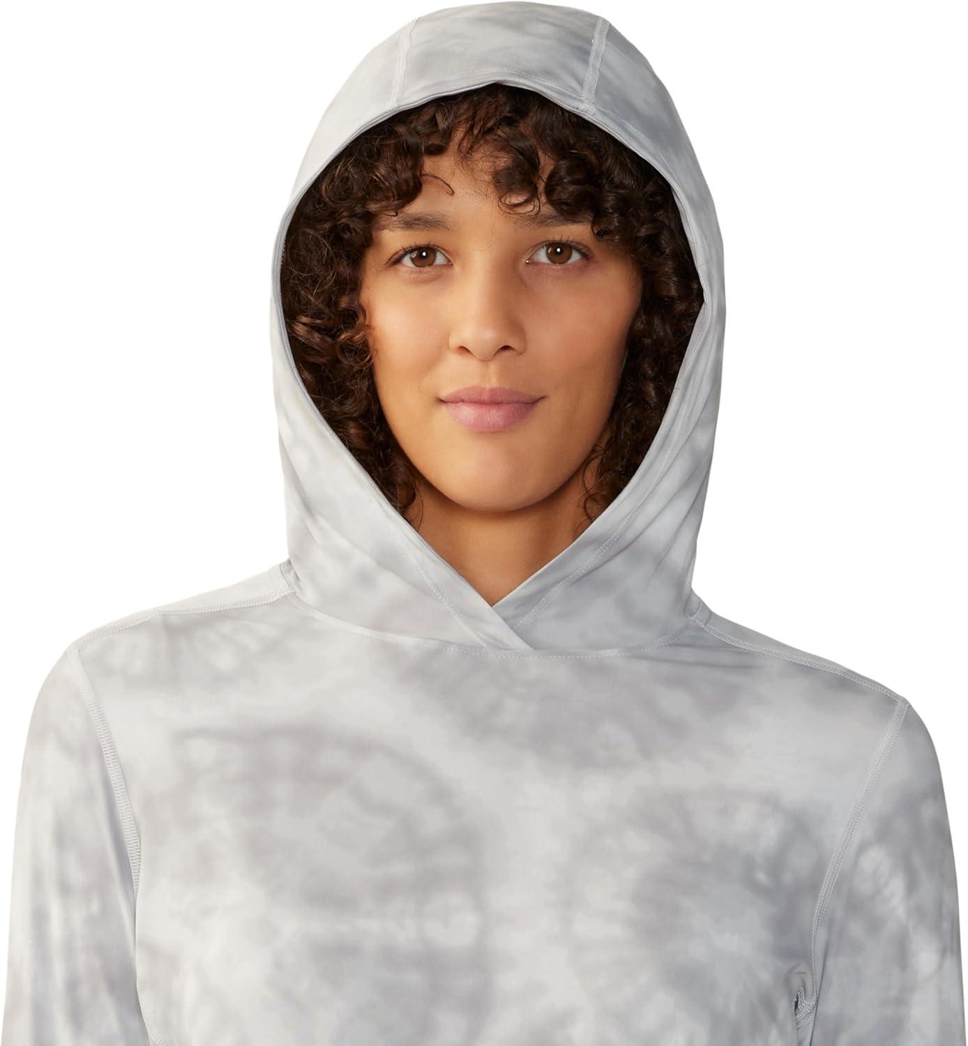 Mountain Hardwear Women’s Crater Lake Long Sleeve Hoody for Hiking, Camping, Backpacking, and Casual Wear(Grey Ice Spore Dye Print)